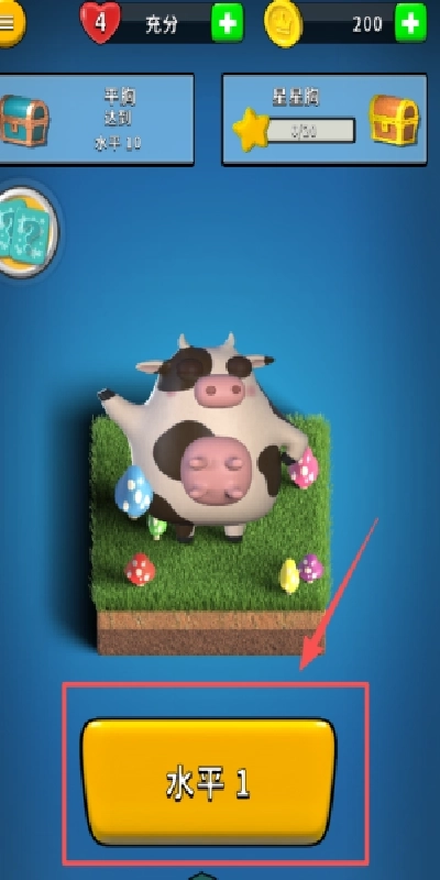 1、查看游戏主界面,点击红色框标注的黄色“水平1”按钮,或是通过查看任务框与奶牛场景,开启第一关游戏。