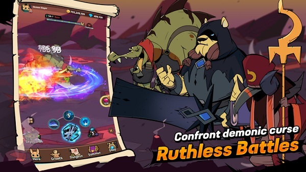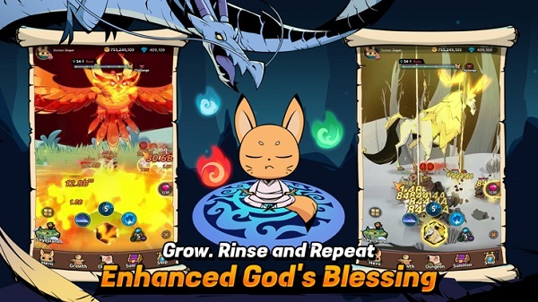 4、解锁强大神话生物的力量,获取祝福与闲置奖励,与它们联手,化身为英雄。