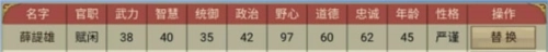 不过!上面的例子为了让大家直观看到变化、突出知府道德的重要性,特意挑选了道德水平最高的官员来替换,但这种做法其实很不合适,这是为什么呢?我们不妨再来看一看薛諟雄的属性数值。