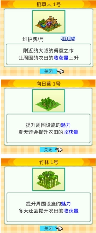 除了道具之外,搭建合适的环境设施同样能够增加作物产量。稻草人在提升产量方面效果显著。另外,部分环境设施会依据季节对产量产生加成作用,例如竹林能提高冬季的收成、向日葵能提升夏季的收成等。