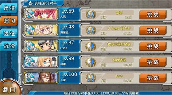 这里各位提督可以和其他提督的舰队一较高下,演习的主要作用其实是一个免费的经验包,因为在演习场中,玩家的舰娘们就算撤退也不需要修理的,并且也不需要补给。所以这里是一个免费的经验包,各位提督也不用在意演习的胜率,这个数值并没有什么实际的意义,只是一个记录而已。