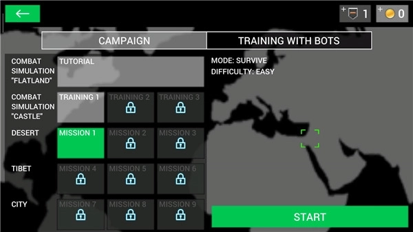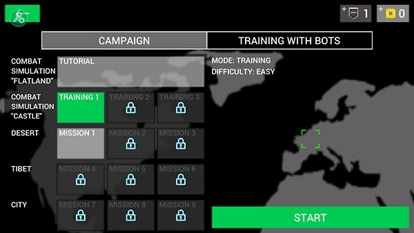 2、在单人模式中,选择要挑战的关卡后点击右下角的START即可开始,这里我们以TRAINING1为例。