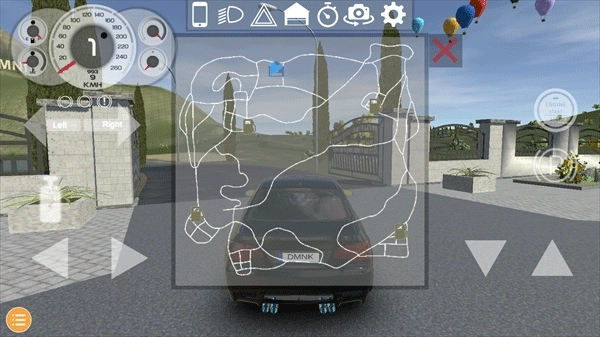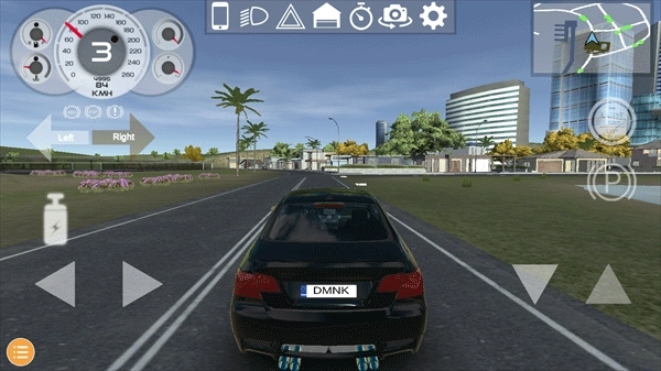 7、通过虚拟方向盘或倾斜设备来操控转向,右下角的“ViewToggle”按钮能够切换追尾、座舱(cockpit)、鸟瞰三种视角,以满足不同路况下的判断需求;