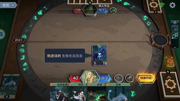 13、点击卡牌后拖动至桌面就可以召唤了,需要注意的是刚进场的生物无法攻击,
