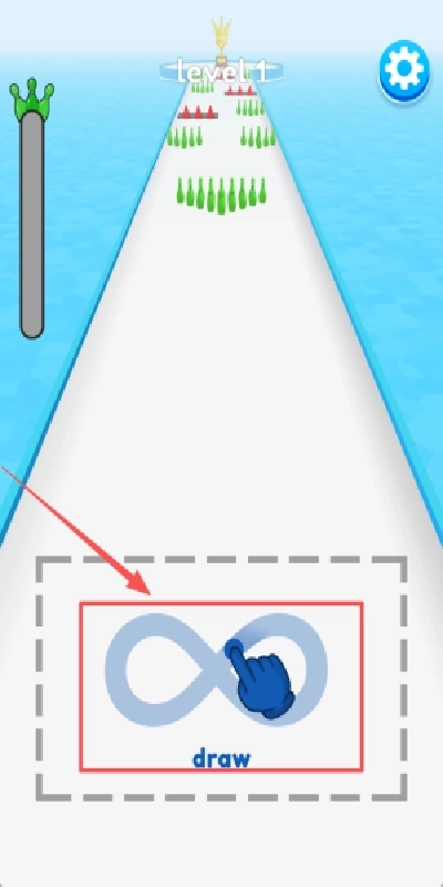 1、当看到蓝色的游戏界面以及右下角的画图区域时,用手指在浅蓝色的画图区里画线,线条画好后会自动变成保龄球道,这样球就能沿着它滚过去撞击瓶子了。