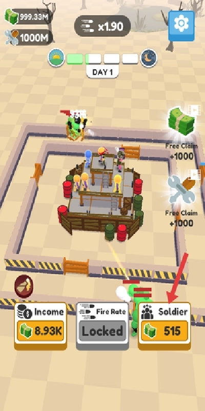 1、游戏开始后,点击Soldier按钮招募基础士兵,并将其快速部署到战场前线,以此增强初始防御力量,应对敌人的进攻。