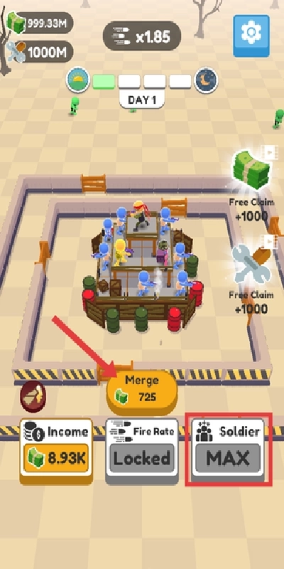 2、当士兵数量达到上限时,界面会出现MAX提示,这时点击Merge按钮,把三个相同等级的士兵合成更高级的兵种,以此提升战斗力。