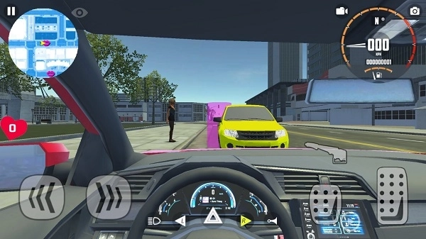 2、操控角色完成上车动作,坐进车内后会看到图中显示的界面:左侧是方向按键(也可点击左上角的“播放”按钮进入设置,挑选适合自己的控制类型),右侧为油门、刹车踏板以及手刹;中间区域则分布着危险报警闪光灯、转向灯、雾灯和喇叭。在熟悉掌握这些操作技巧后,接下来就查看地图上的乘员位置,然后将其送往目的地吧!