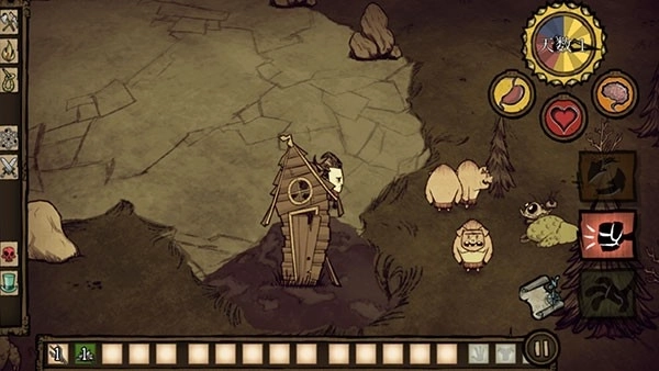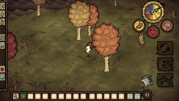 6、游戏随即正式开启,左侧的按键用于控制角色方向,右侧的按键则负责资源收集,玩家需要尽可能收集所有可利用的资源,以此来躲避饥荒的威胁。