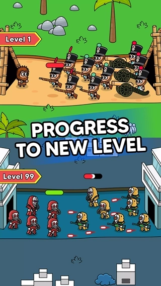 《战斗进化战术战争》是一款画风略带可爱风格的策略战争游戏。在游戏中,玩家会体验不同的时代变迁,每个时代都有独特的武器与兵种可供解锁使用,能从中感受到历史的厚重感——从原始的石器时代一路发展到热兵器主导的火器时代,游玩过程十分有趣。而且这款游戏对操作要求不高,玩家只需通过策略性的阵容布置,就能顺利开启闯关挑战。
