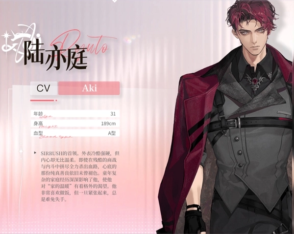 SIRRUSH的领头人。看上去冷峻强硬,内心却藏着极致的温柔。即便在残酷的商战与内部争斗里奋力厮杀、闯出一条生路,心底那份纯粹的善良始终没有改变。童年复杂的家庭过往对他影响至深,让他对“家的温暖”有着异乎寻常的渴求。他十分热衷于烹饪,可一旦陷入紧张状态,就总会不小心出错。
