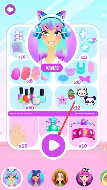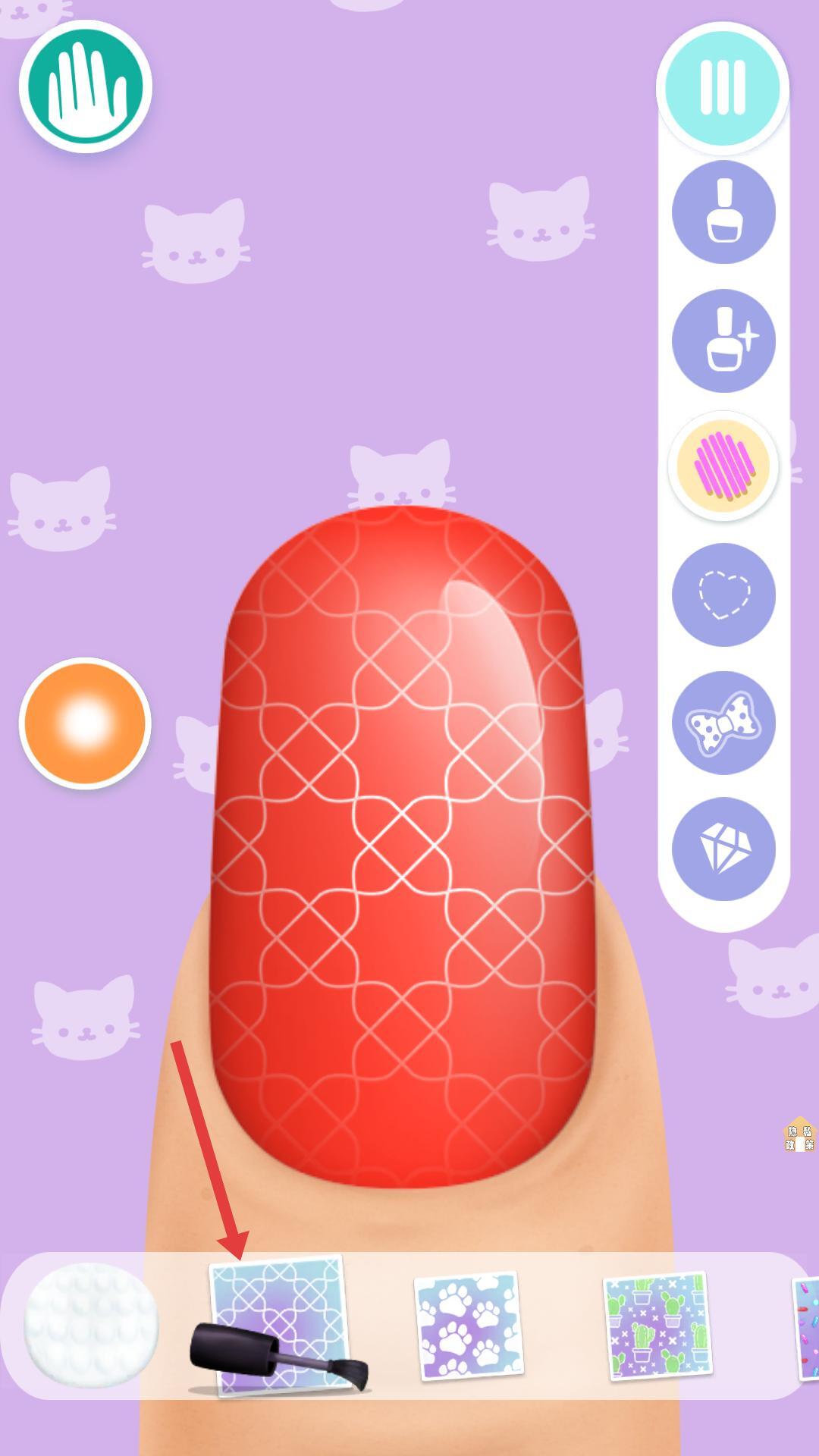 3、进入美甲设计界面后,滑动底部的图案栏,挑选出你喜欢的图案,点击将其应用到指甲上,就能设计出独特的美甲样式啦。
