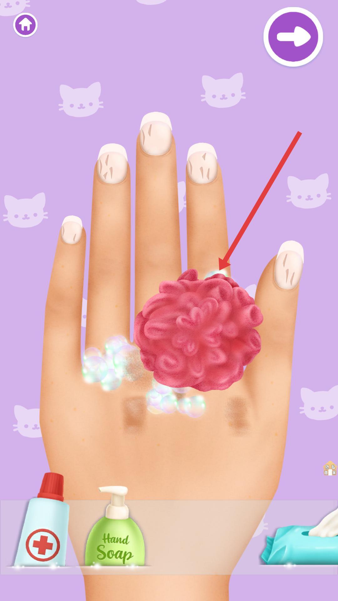 2、进入手部护理页面后,点击清洁工具,用它擦拭手部的污渍,完成清洁步骤,让手部变得洁净,这样后续才能更好地进行美甲操作。
