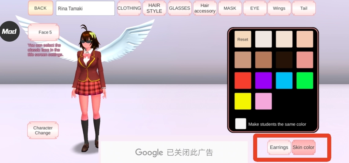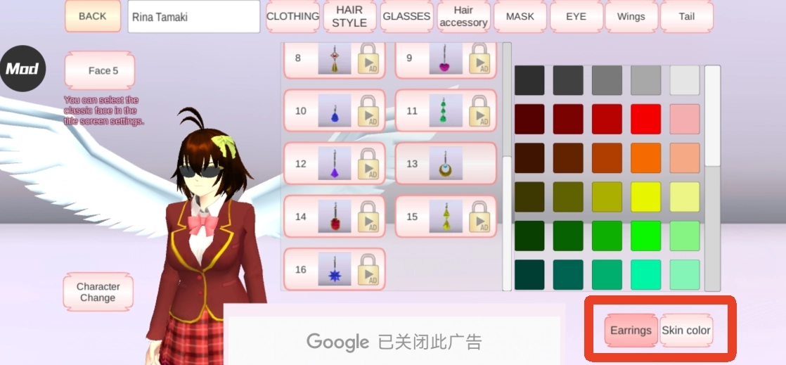 7、在右下角还有耳环和肤色的选择不要忘记了哦,肤色除了常见的几款,还有一些很有趣的颜色,比如绿色、黄色和蓝色等等。