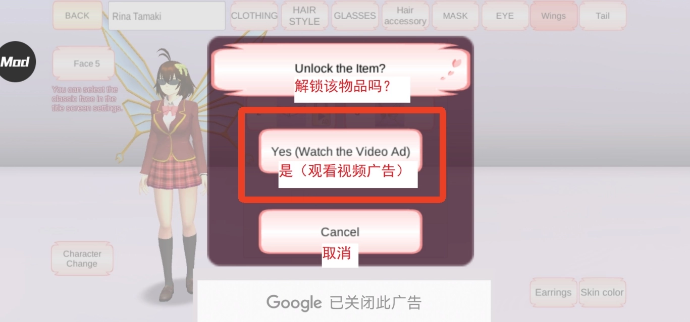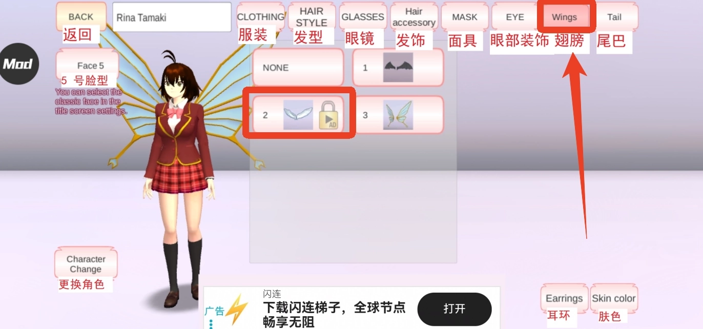 5、不用担心,我们已经开启了MOD,点击上锁的翅膀之后再点击【Yes(WatchtheAd)】,就能成功解锁了。