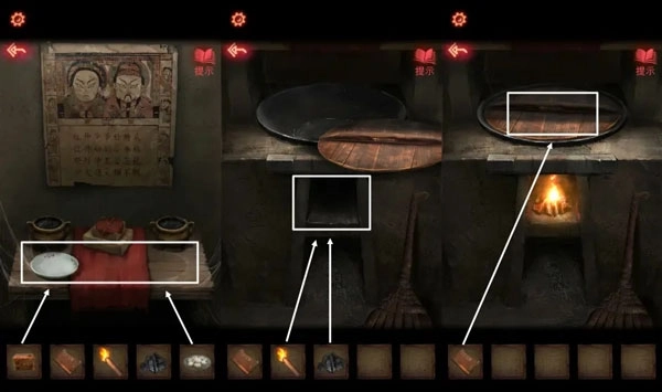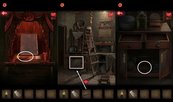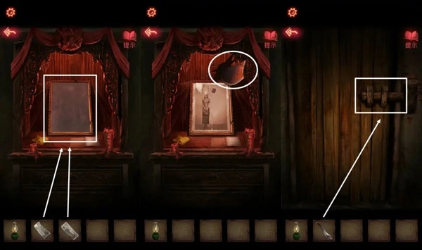 14、把两张【半张照片】拼接起来放进相框,会触发机关,之后在神龛的木板位置能拿到【鬼头刀】。用【鬼头刀】砍开挡路的木门,就能成功从封闭空间里逃出去了。