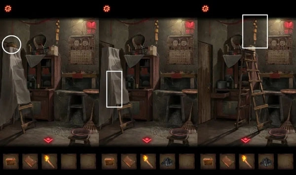 3、通过攀爬梯子来获取【煤炭】,先点击梯子上的布帘,之后将梯子移动到中央位置,再触碰天花板上悬挂的铃铛以触发机关。