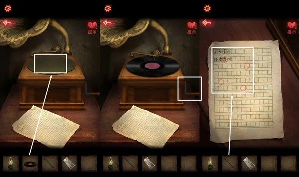 10、把摊在地上的油纸伞收起来,留意孩童是否有异常情况。将【唱片】放进留声机,转动把手播放音乐,接着用【铅笔】轻轻点一下桌上的歌词纸来触发互动。