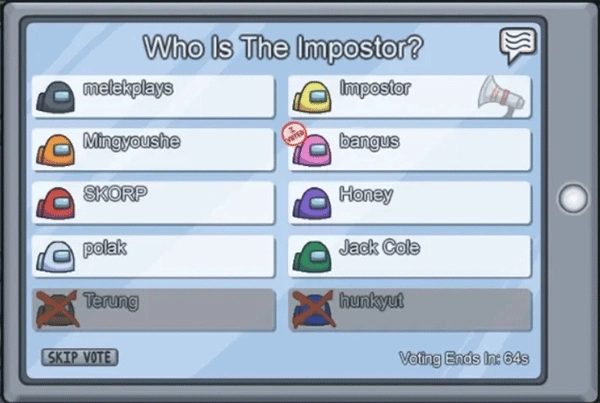 若暂时没有明确的指向目标,建议选择弃权以避免误伤到他人;要是有充足的依据,就可以直接这样陈述:“Isaw[Color]killat[Location].”(我在某个地点亲眼看到某色玩家进行行凶)