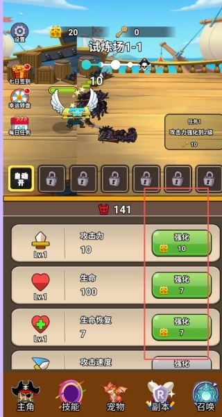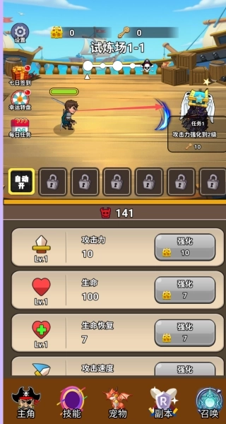 1、进入游戏后,我们能看到主要玩法是操控角色在试炼场里持续战斗与升级。