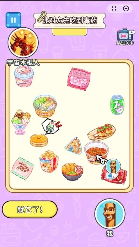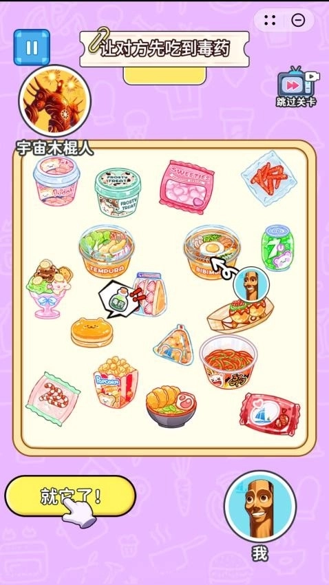 1、在关卡中你需与宇宙木棍人或是其他的山海经怪物进行PK对决,为对手挑选适合投放毒药的物品。