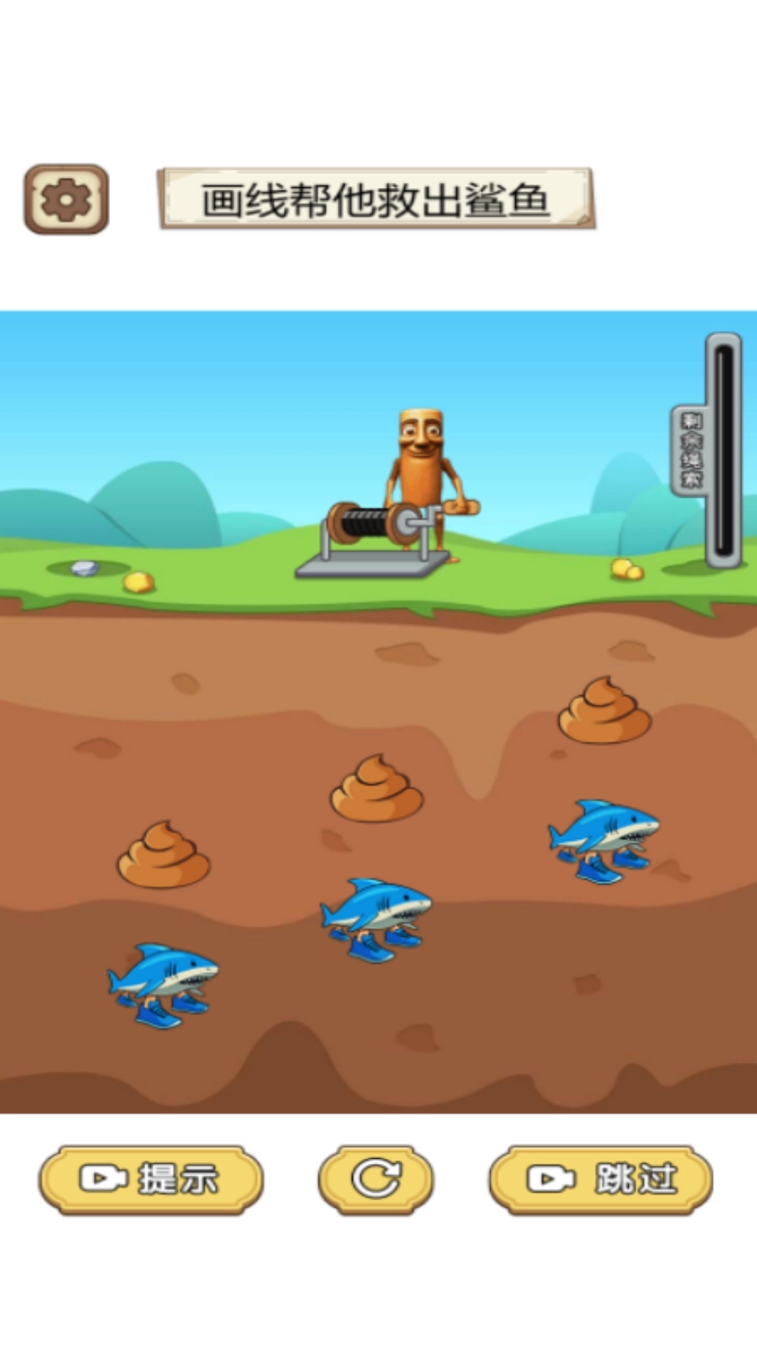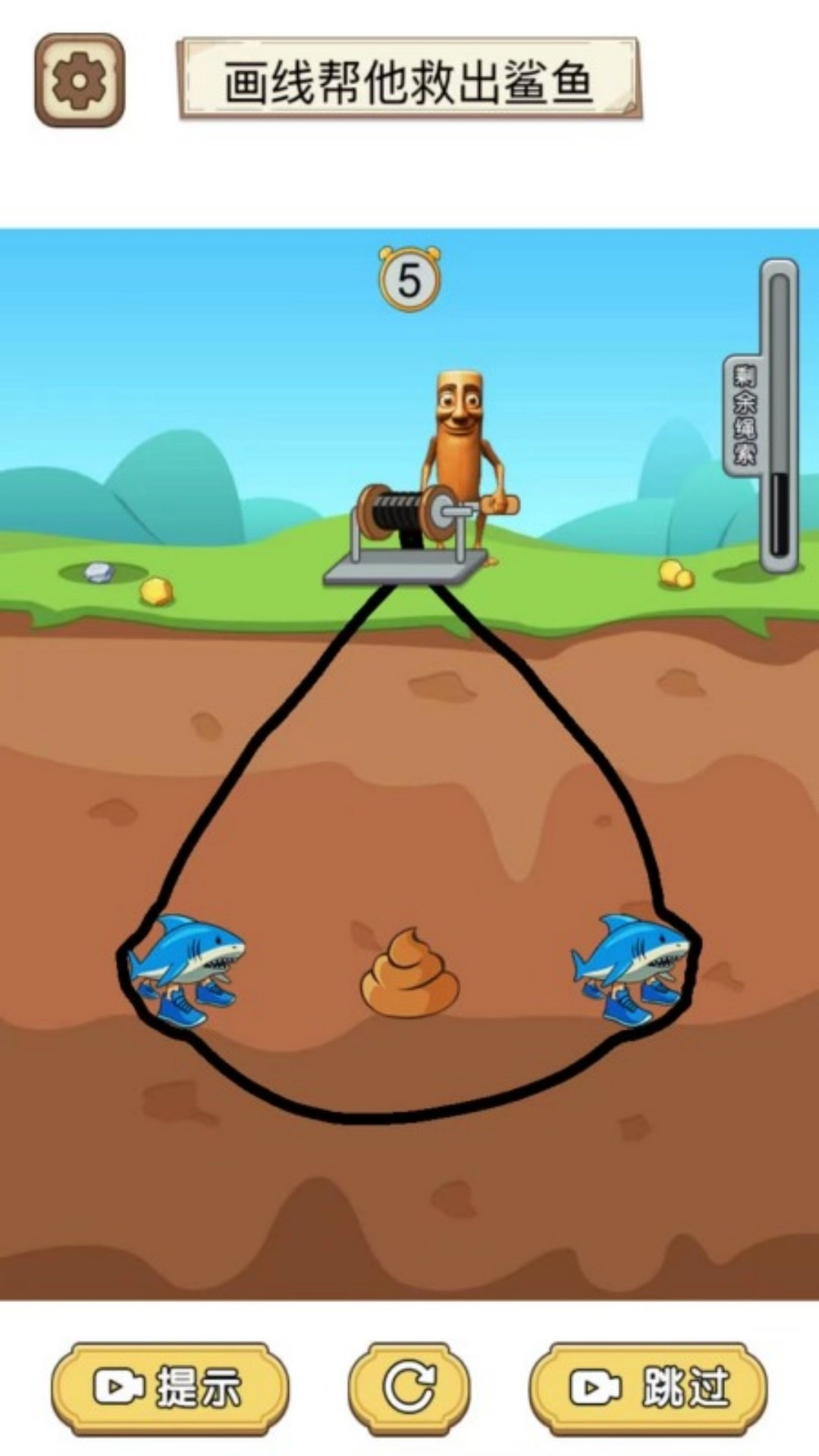 玩画了个毛线游戏的时候,玩家每次画线都需要注意它的长度,因为关卡里面对绳索的长度是有要求的,你必须在规定的长度内,将地下的鲨鱼救起来!游戏设置了免费刷新功能,如果玩家觉得当前的挑战无法完成,可以刷新一次重新挑战!