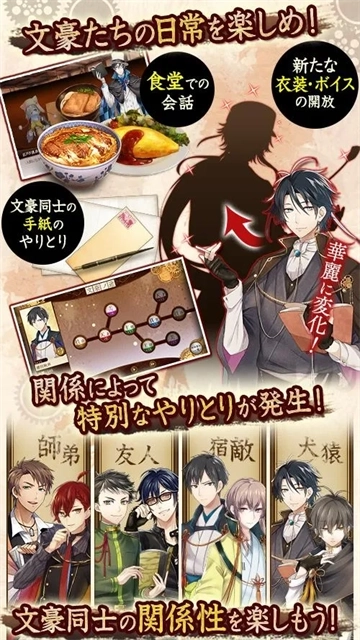 《文豪与炼金术师》中文版是一款兼具文学底蕴与奇幻策略元素的女性向SLG游戏。游戏延续了系列一贯的高水准美术风格,不仅拥有细腻且考究的角色立绘,更邀请到豪华声优阵容加盟——例如为芥川龙之介配音的诹访部顺一、演绎太宰治的中村悠一、诠释萩原朔太郎的野岛健儿,以及为中原中也献声的福山润等知名声优,共同为玩家构建出一个沉浸感拉满、视听体验原汁原味的日式文学幻想世界。