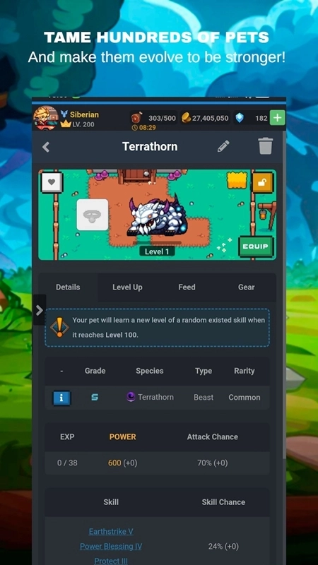 7、宠物既能通过打怪来提升等级,也可以点击屏幕右侧上方的“EQUIP”按钮为其装备物品。