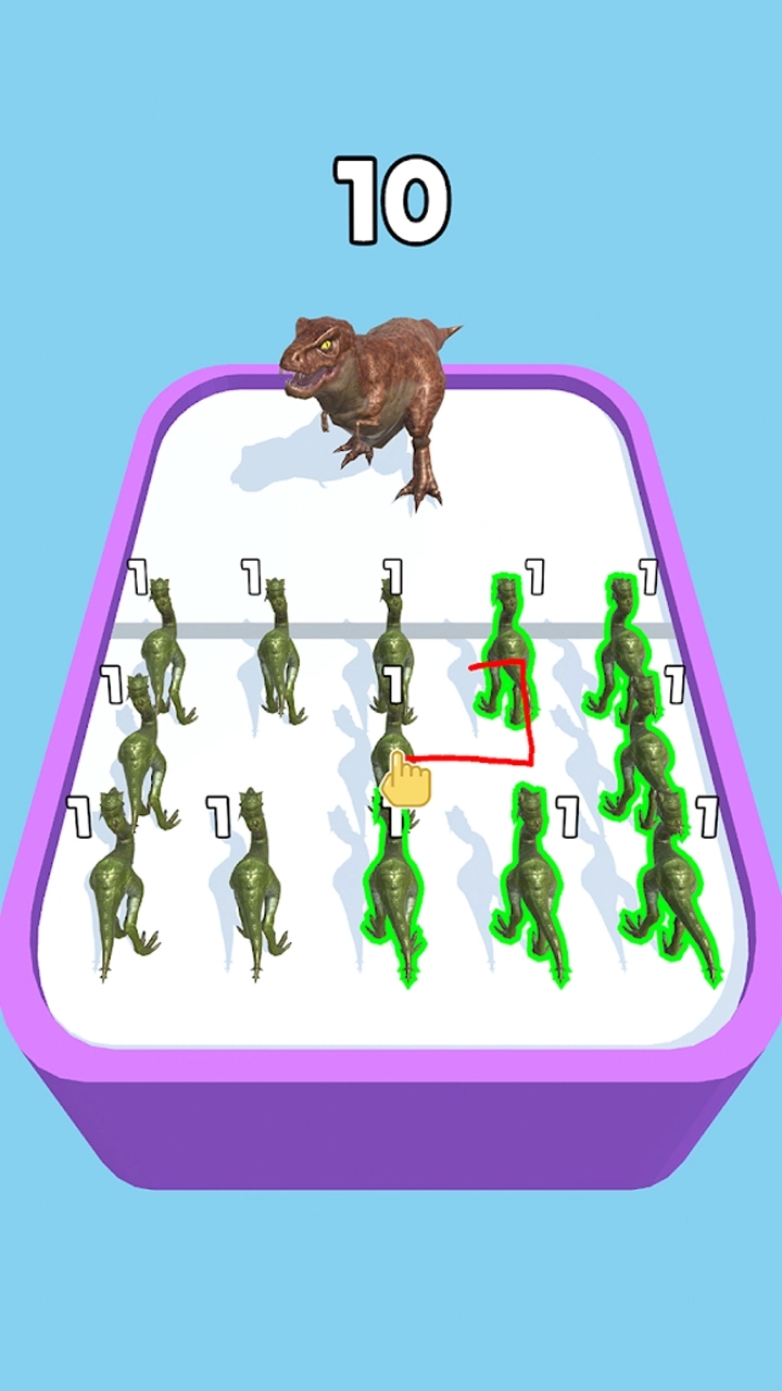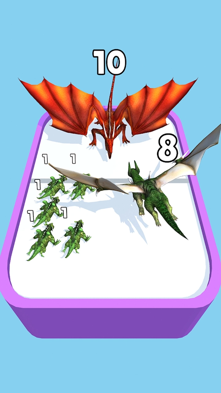 1、秀出你的超快手速,快速合并恐龙,增强队伍的战斗力,拿下所有比赛的胜利。