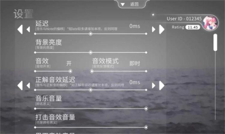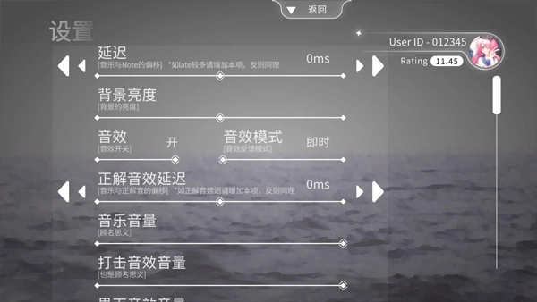调整设置:借助主界面的设置功能,能够自定义背景透明度、音效音量、判定灵敏度等各项参数,以此营造个性化的游戏氛围,增强整体操作的舒适感。