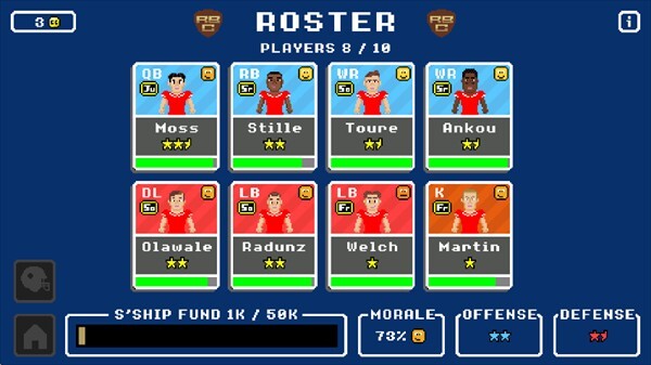 游戏整体采用像素复古风格,能为你带来更多乐趣与惊喜体验。你可以见证亲手培养的球员逐步成长,在这个世界里尽情书写专属于你的球员传奇故事;而借助心理辅导与团队活动,还能有效提升他们的专注力。