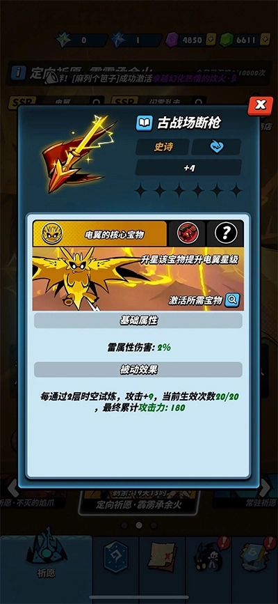 UP池策略:全力冲刺「电翼龙」限定卡池。定向选择务必锁定【古战场断枪】——这是召唤电翼龙的唯一核心凭证;另一选项为技能类道具,非必需。若预算有限,建议抽至获得该武器即停手;若欧气爆发,顺带拿下配套技能亦属锦上添花。通常2–3日即可稳稳入手,无需等待后续卡池——下一期火系UR龙同样依赖此枪作为召唤钥匙,绕不开也等不起。
