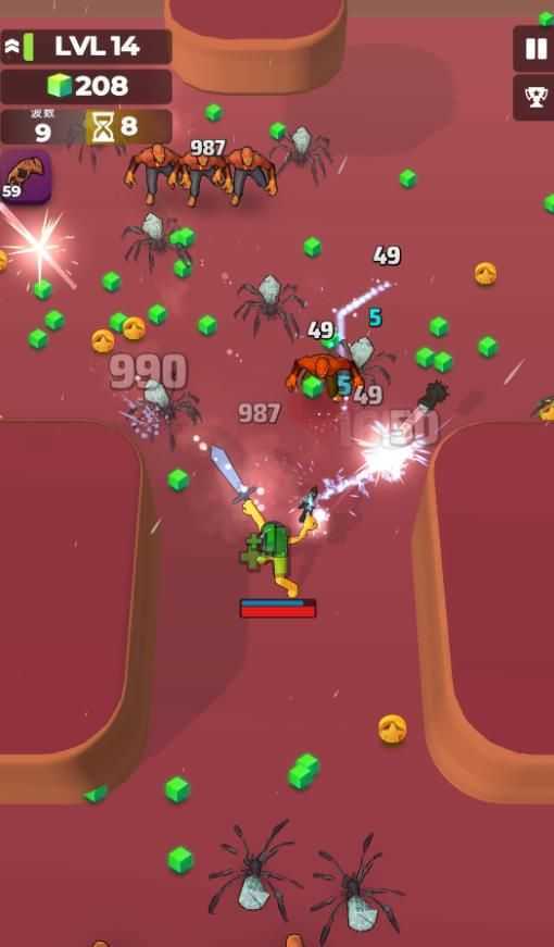 3、从LVL1起挑战一波波逐渐变强的怪物,以此考验生存能力与技能搭配的策略。