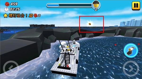 玩家进入海上警察关卡后,先挑选合适的海上交通工具,随后开启游戏。在追逐坏人的过程中,要留意金砖位于海上一处礁石圈中。玩家需操控海上交通工具驶入金砖所在区域,借助金砖附近的跳板让自己升高,接着调整方向朝着金砖前进,这样就能获取金砖了。