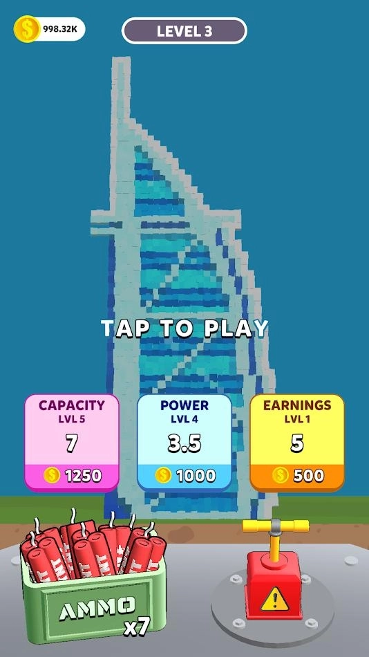 4、一次爆破成功才可以获得更多的收益,直接将高楼炸塌掉就可以获得奖励。