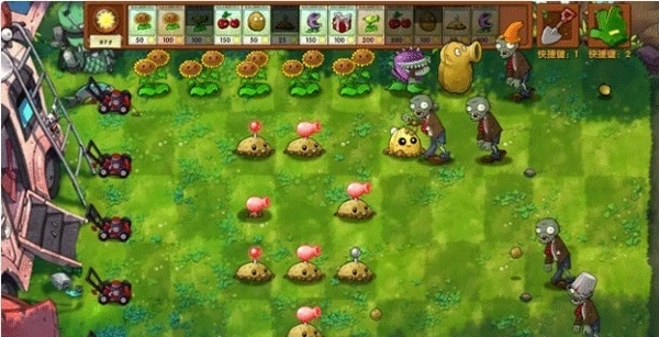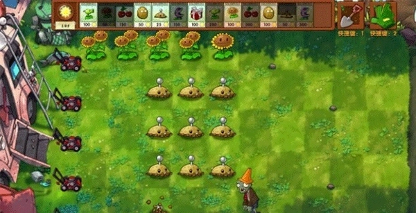 1、游戏开局时用樱桃炸弹清除土豆,同时在第一排把向日葵种满,一个土豆雷的生效时间完全足够用来完成向日葵的种植。