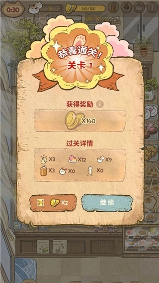 5、在《喵之料理大师》游戏里,每成功挑战一个关卡,都能获得对应的关卡资源奖励。