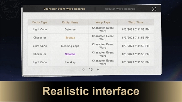 崩铁抽卡模拟器(全卡池)是一款休闲娱乐的抽卡模拟器,在这里玩家可以体验到不用氪金也可以享受到角色、光锥无限次抽卡的快乐。除了模拟抽卡系统外,游戏还高度还原崩铁的抽卡环境与动画,让玩家能沉浸式体验纯粹的抽卡乐趣。