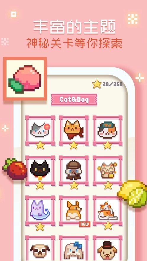 这是一款充满乐趣的休闲游戏,玩家需要挑选素材来拼凑出完整的像素图案。每一关都会呈现不同的卡通像素形象,填充那些可旋转的素材时还能进行上色操作,你可以尽情发挥想象力,完成一幅幅变化万千的像素萌图,挑战海量欢快有趣的关卡,此外还有特别的故事等你去探索发现。