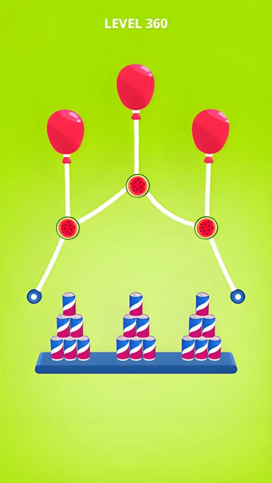 2、遇到多根绳子别乱剪!优先剪离小球最近或者能让小球获得最大力气的那根,这样小球掉下来的冲力更大,更容易一次性推倒所有瓶子,不用反复尝试,省时间还过瘾。