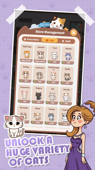 2、玩家能够借助互动与养成玩法,一步步解锁更多的猫咪角色。同时,玩家还得负责经营和管理属于自己的猫咪咖啡馆,具体涵盖了咖啡馆的装修设计、新饮品的研发创新以及营销策略的规划制定等方面。