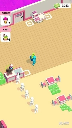 2.玩家可以通过简单的轻触操作,收集和升级各种资源,建设自己的冰淇淋咖啡馆,并招募员工,开发新的产品等。