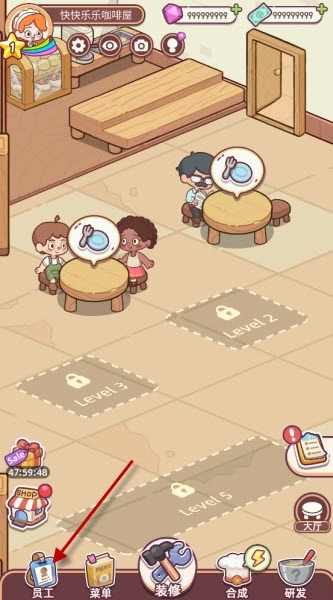 1、员工在我们离线时可以帮助我们经营店铺,是非常重要的,点击主界面的员工按钮。