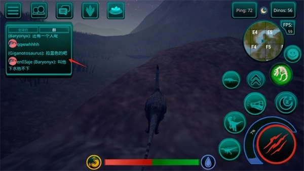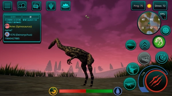 3、资源获取方式多样。如果你是肉食恐龙,则需猎杀其他玩家控制的恐龙获取食物;若为植食恐龙,则可寻找地图中的蕨类植物补充能量,湖泊与水塘则提供了充足的水源。