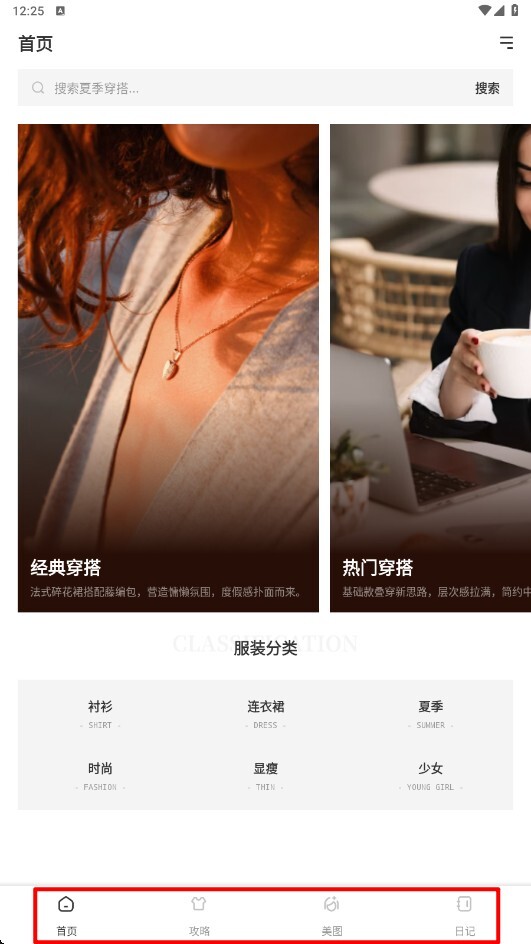 2、如图所示,首页支持选择经典穿搭或热门穿搭,也能依据服装分类来挑选穿搭。下方栏可以选择自己想使用的板块,既能查看攻略、制作美图,还能撰写穿搭日记。