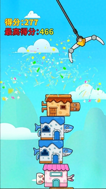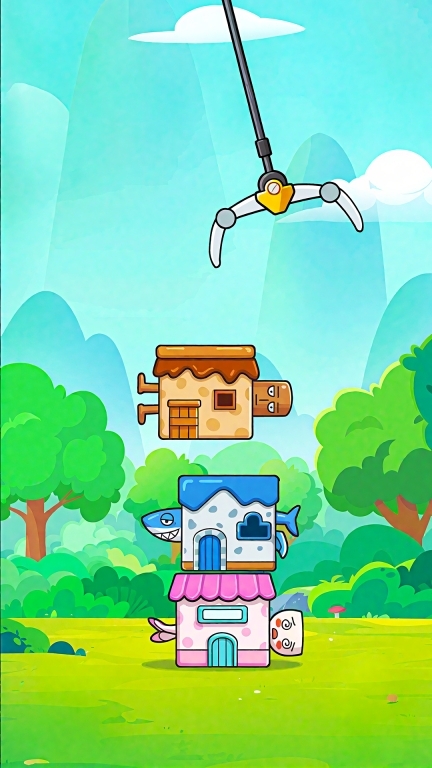 1、操控巨型爪臂抓取各种造型的小屋,精准安放至已搭建的塔层之上,尽力维持塔的平衡并使其持续增高。