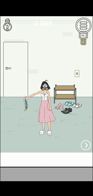 第四关的场景布局和第三关类似,同样包含两个房间。这次老公把私房钱藏在了自己的袜子里,不过这袜子的气味实在有点特别。你得先去另一个房间,打开衣柜找到防毒面具戴上,然后再回到原来的房间,点击男士鞋子,把袜子拿出来,这样就能拿到里面的私房钱了。