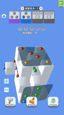 这是一款特别解压的游戏,玩法就是通过拧下螺丝来收集并消除它们,最终目标是把所有螺丝都拆卸完毕。