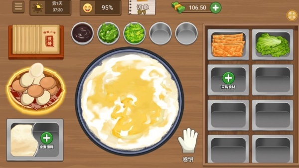 3、天气状况、节假日以及周边举办的活动,会影响客流量和特殊订单情况(比如雨天外卖订单较多),因此需要灵活调整经营策略。1、依据“倒面糊→摊平→打蛋→翻面→刷酱→加料→折叠”的步骤来一步步操作,每个环节都有最佳时机的提示。