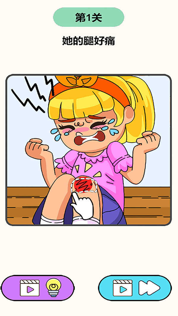 2、第一关,围绕“她的腿好痛”这一情况,按照提示进行操作,处理女孩腿部的伤口,以此完成该关卡。